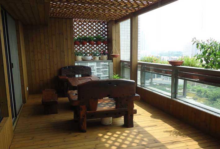 將需求裝置的空中用螺絲和鍍鋅角碼固定龍骨,不銹鋼十字螺絲在防腐木的正面與龍骨銜接鋪設(shè);