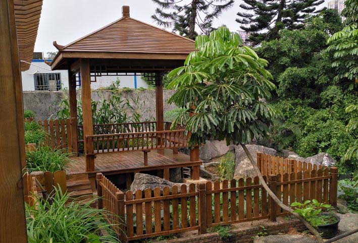 3、涼亭材料選擇 社會上防腐木是很多種,各種不同的防腐木其具有的效果是不一樣的。所以我們在建造涼亭的時候要注意涼亭防腐木材料的選擇上,要留意避免選到開裂或者是變形的防腐木了。